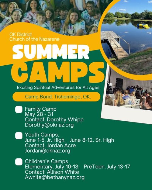 Please join us at Camp Bond for Family Camp to worship our Lord and Savior Jesus Christ together as the Oklahoma District Church of the Nazarene family.
